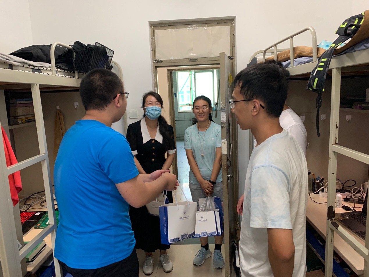2022年9月8日下午,公司党委书记朱颖和副书记谷萌到员工宿舍看望同学们。朱颖书记亲切地询问同学们从沙河校区搬迁到公司路校区后是否适应新环境,学习、生活有无遇到困难。同学们表示较为适应新环境,新学期会高质量完成好课业学习和科研实践。朱颖书记也嘱咐同学们绷紧疫情防控之“弦”、珍惜时光、刻苦学习,并为同学们送去了北航定制月饼,祝同学们中秋快乐。